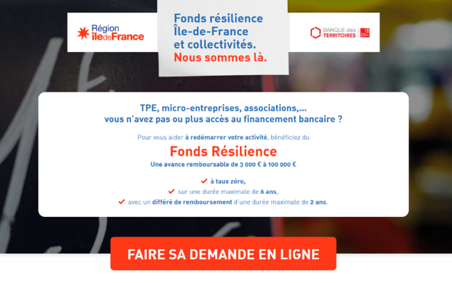 La Région Île-de-France, la Banque des Territoires, la Ville de Paris ainsi que 70 autres collectivités territoriales franciliennes ont ensemble créé en juin 2020 le “Fonds Résilience Île-de-France & Collectivités” pour venir en aide aux entreprises impactées par la crise du COVID-19. Une aide prolongée jusqu’au 17 mars 2021.